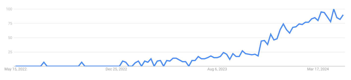 Here’s a chart from Google Trends showing search interest in “romantasy” over just the last 2 years: