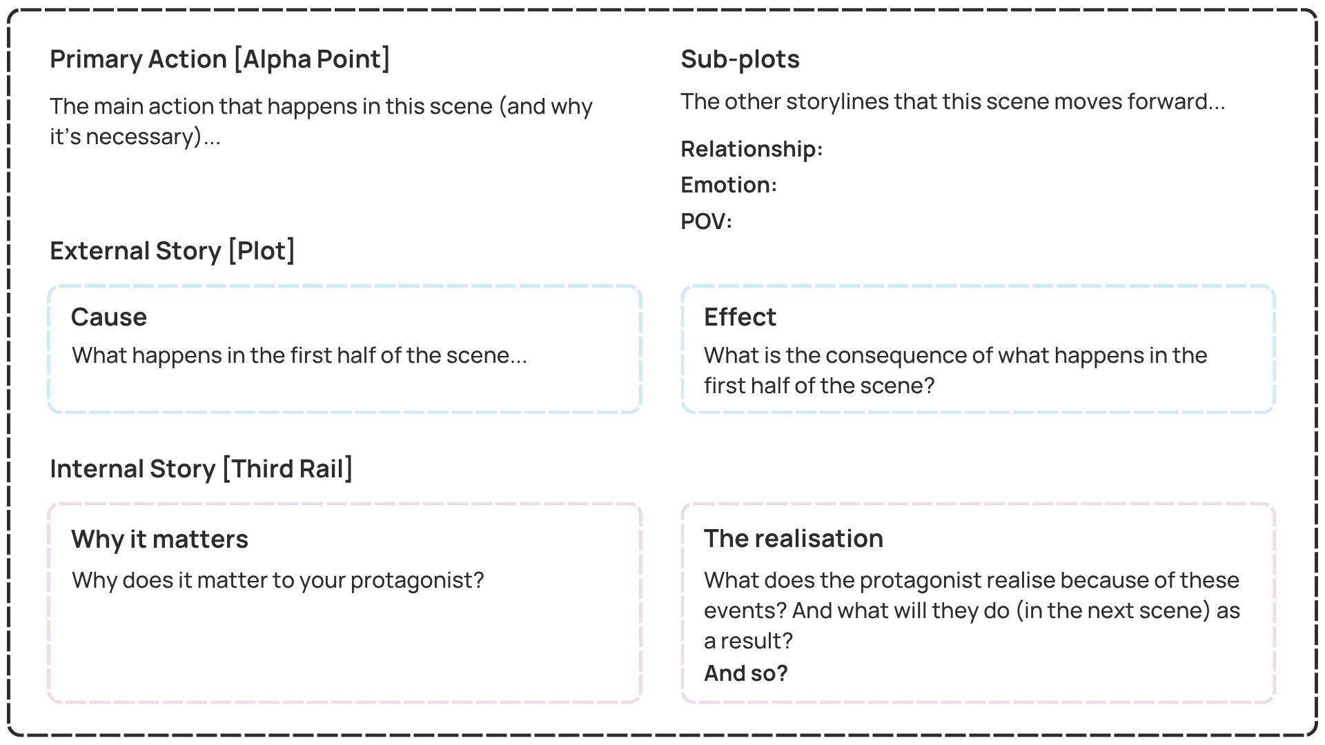 The way I’ve built this into my own writing process is through the Story Genius scene outline I already use inside First Draft Pro. Since starting improv I’ve quietly added a small new section at the top of my classic scene card — three lines for relationship, emotion, and POV.